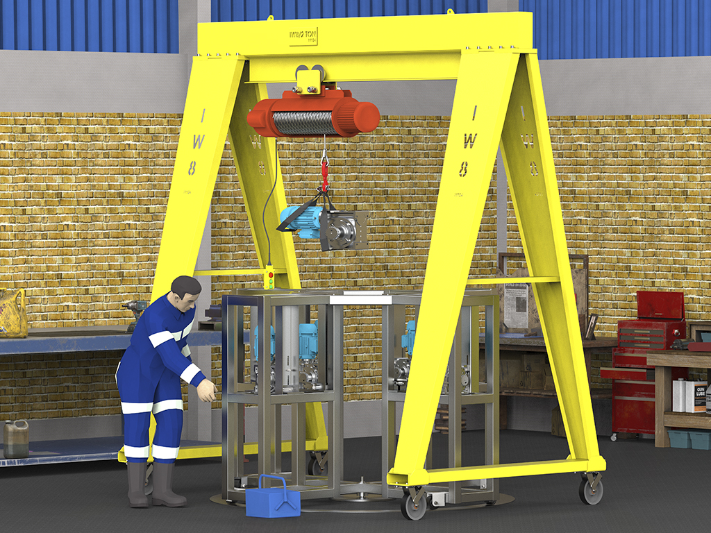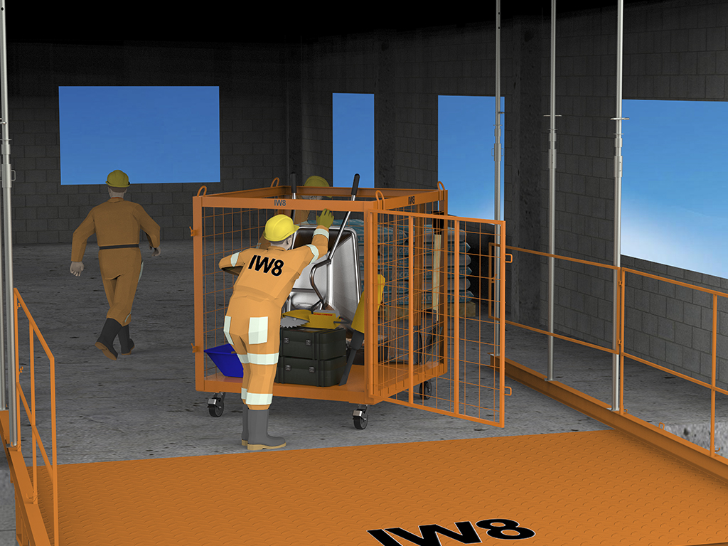 Gaiolas, cestos e plataformas para movimentação segura de cargas.