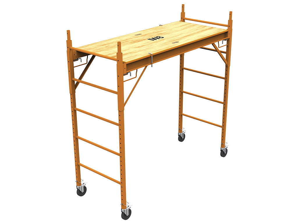 Escada plataforma com guarda corpo e rodas para acesso seguro em obras, depósitos e indústrias.