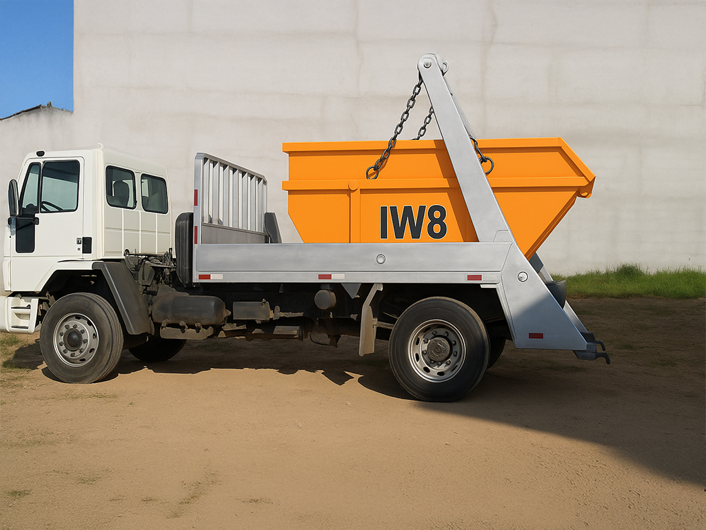 Principais tipos: caçamba de entulho estacionária (Brooks) para poliguindaste; caçamba basculante (acionamento por basculamento — temos versão para obra/guindar); caçamba para caminhão (fixa do veículo, popularmente “caçamba de caminhão”); e caixas com tampa ou divisórias para coleta seletiva. A IW8 fabrica versões sob medida, com dimensões e volumes diversos, identificação e pintura PU.