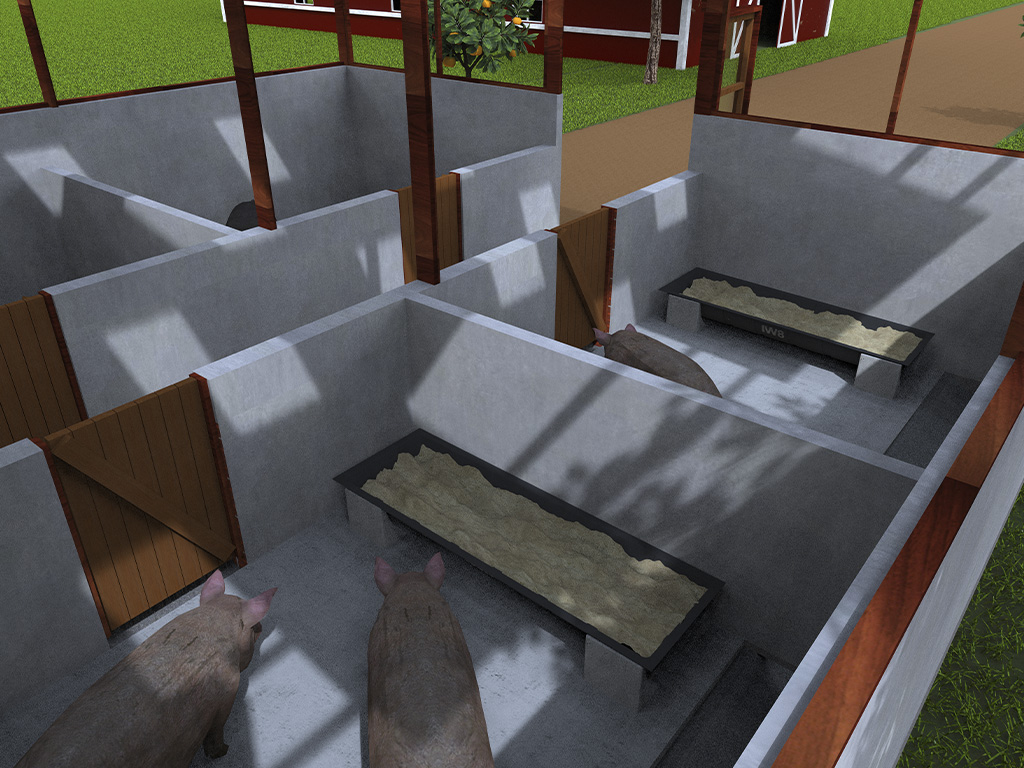 A altura útil costuma ficar entre 2,8 m e 3,5 m, com boa ventilação/iluminação natural e pé-direito que reduza odores e calor. Portas com 1,2–1,4 m de largura e 2,2–2,4 m de altura favorecem a passagem segura do animal e do tratador. Adeque ao seu projeto arquitetônico, clima local e normas municipais.