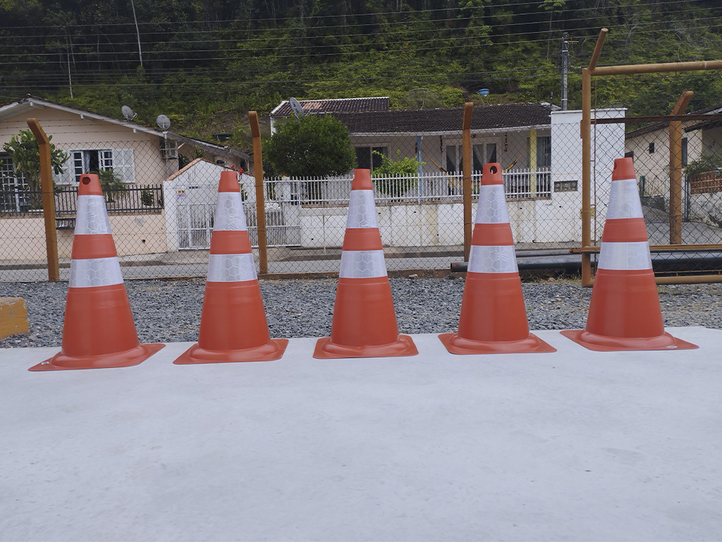 Cones de sinalização para trânsito e obras, fabricados em material resistente, ideais para controle de fluxo, segurança viária e organização de áreas.